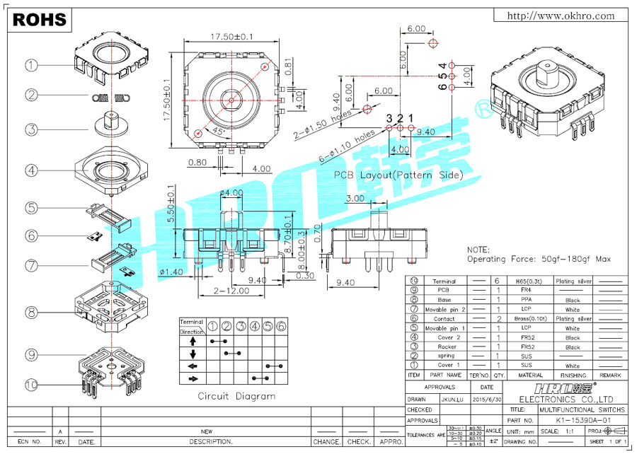 规格:17.50*17.50mm操作力:50 ~180 gf功能:手柄摇杆开关