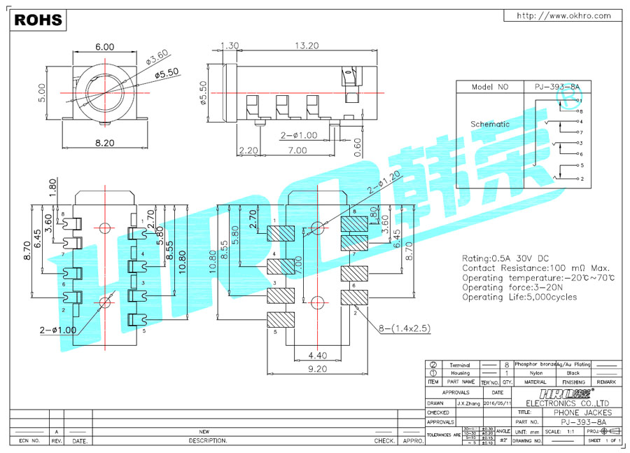 | 1. 额定负荷: DC 30V 0.5A | 2. 接触阻抗: ≤100mΩMAX |